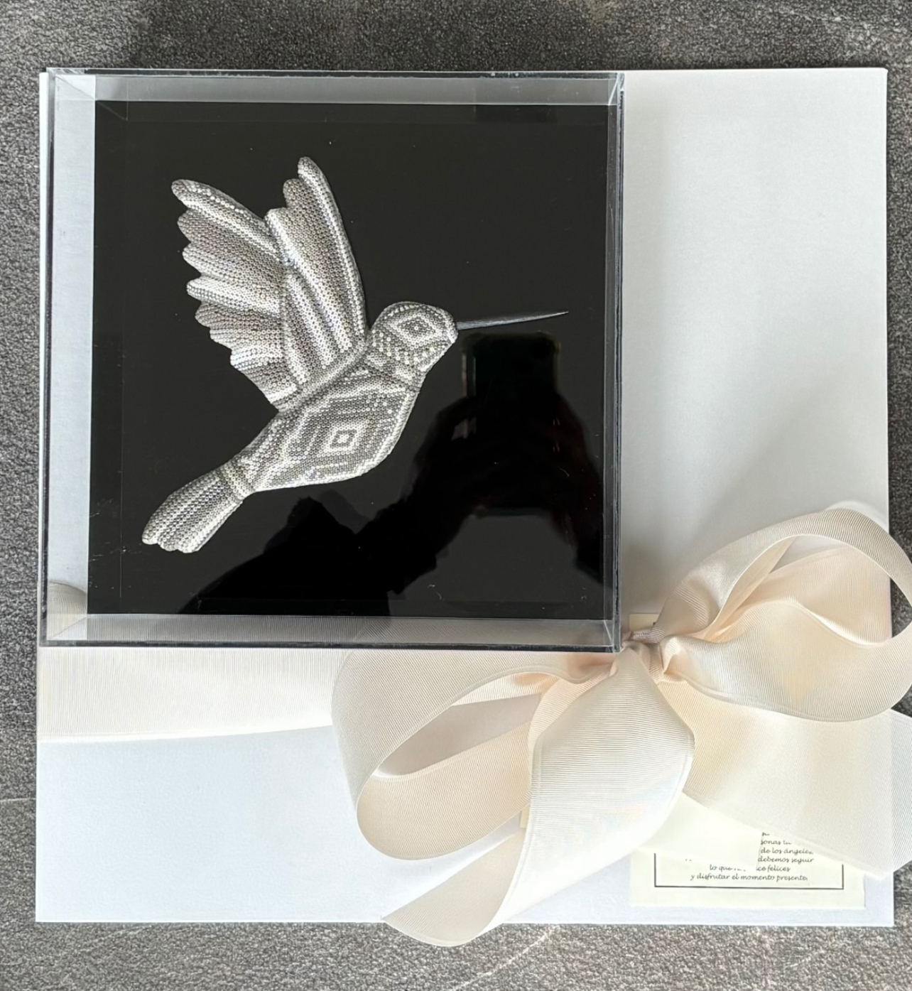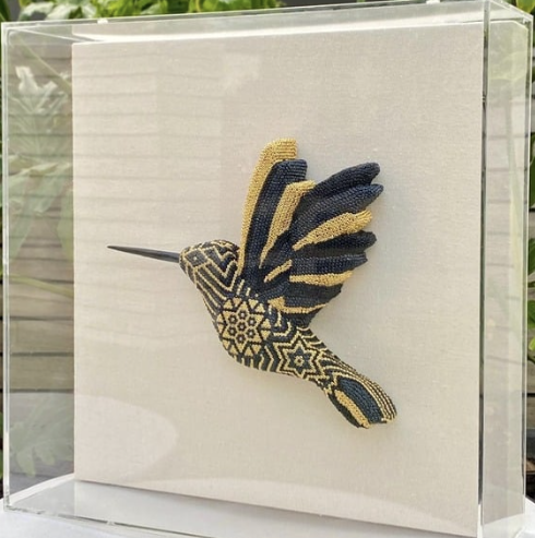 Colibrí con Arte Huichol doble cara sobre pedestal